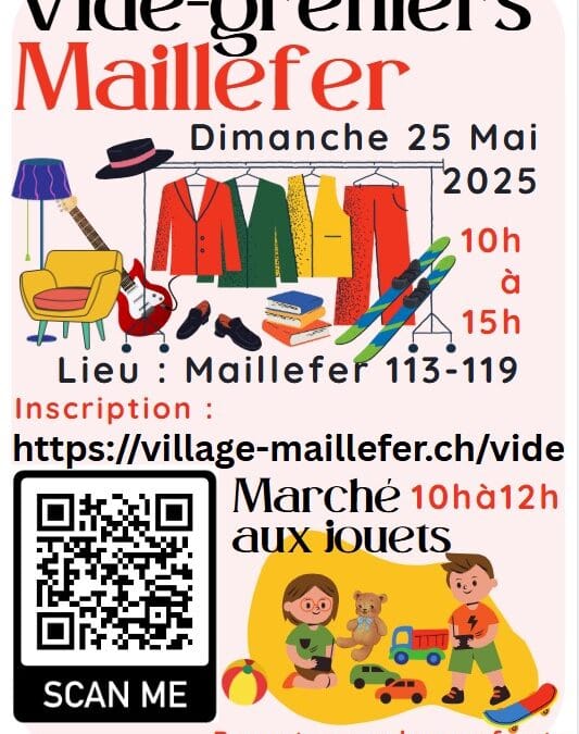 Vide Grenier par AVM | 13 Avr 2025 | Passé | 3 commentairesDimanche 25 mai 2025 de 10.00 à 15.00Lieu : Maillefer 113-119Marché aux jouets de 10.00 à 12.00par et pour les enfants S'inscrire3 Commentaires Fodil Nacera sur 29 avril 2025 à 22h11 Marché aux jouets Sarah Réponse Fodil Sarsh sur 5 mai 2025 à 9h28 Stand pour enfantsMon fils veut faire un stand pour nourriture est-ce que c’est possible (couscous, petit pas à l’orange) Réponse AVM sur 7 mai 2025 à 9h10 Bonjour,Malheureusement nos autorisations ne nous permettent de vendre de la nourriture que par l’Association durant cet événement.Mais nous allons y réfléchir pour nos futurs événements. RéponsePoster le commentaire Annuler la réponseVotre adresse e-mail ne sera pas publiée. Les champs obligatoires sont indiqués avec *Commentaire *Nom * E-mail * Site web Enregistrer mon nom, mon e-mail et mon site dans le navigateur pour mon prochain commentaire. Δ